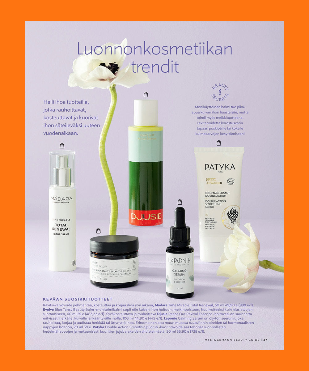 Djusie's products look like candy packaging and, on top of that, they work. The mandarin-scented cleansing cream is natural cosmetics and suitable for all skin types, especially dry and sensitive skin. The rich cream rinses off effortlessly and leaves the skin feeling refreshingly soft.