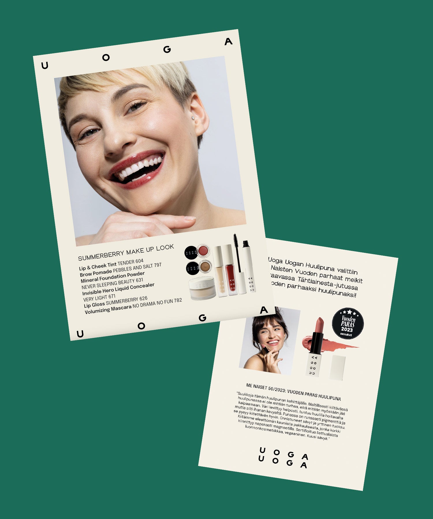 Uoga Uoga takes natural seriously but is all about functional, active and easy to use in both makeup and skincare. The core of Uoga Uoga (“berry berry”) right from the start has been the company's belief that natural ingredients are awesome. Therefore, Uoga Uoga enriches their skin care as well as make-up products with such proven efficient active ingredients as hyaluronic acid, phytosterols, flower acid, beta glucans and the likes.